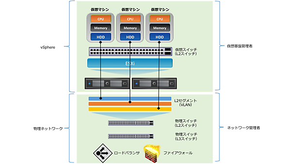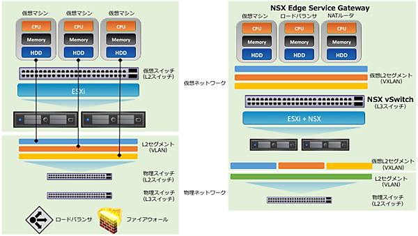既設の物理ネットワークに接続することを前提としたサーバ仮想化であれば、この仮想スイッチの機能は十分なものでした。しかしSDDCを実現するためにデータセンター全体を仮想化するには、L3スイッチ、ルータ、ファイアウォール、ロードバランサといったネットワーク機能を提供するネットワーク機器が不可欠です。それらのネットワーク機器はサーバ仮想化とは独立して、ネットワーク機器ごとに管理する必要があります。