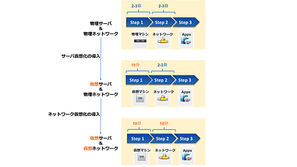 現状のシステム基盤は、単一システム内でサーバとネットワークで担当者が独立して、それぞれ運用管理も独立しているサイロ化が起こっているというのが実情です。また仮想サーバはテンプレートから10分で展開が完了しても、仮想化されていないネットワークリソースの準備に時間がかかっては、結局アプリケーションは利用できずシステムとして提供速度を劇的に変えることが難しいという迅速性の問題も抱えています。