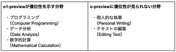 この結果は、o1-previewが主にSTEM分野や論理的思考に特化して開発されたことに起因しています。文章生成には、文脈理解、言語の微妙なニュアンスの把握、創造的な表現力など、異なる種類の能力が要求されますが、これらの能力は、純粋な論理的推論とは異なる性質を持つため、現状のo1-previewのアーキテクチャでは十分にカバーされていない可能性があります。