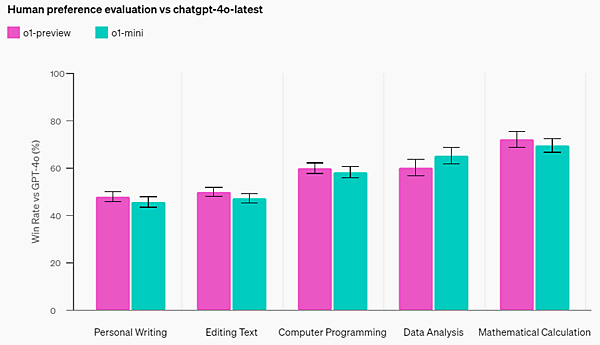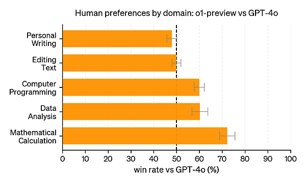 以下に、人間の嗜好をo1-previewとGPT-4oで比較したグラフと、このグラフから分かることを示します。