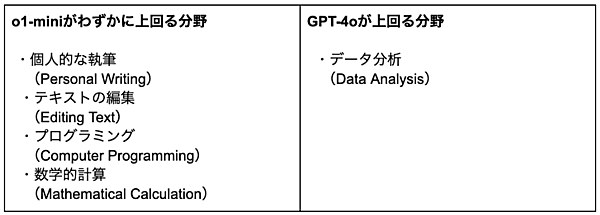 一方、o1-miniとGPT-4oとの比較では、その傾向が若干異なります。