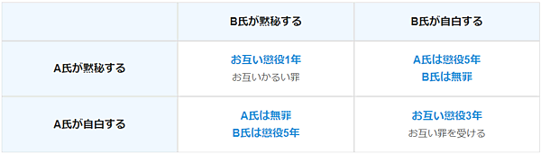 - もし一方が裏切り、もう一方が黙秘すれば、裏切った方は無罪放免、黙秘した方は重罪となります