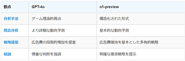 両モデルは、戦略提案と結論の面で明確な違いを示しました。GPT-4oはゲーム理論を用いた詳細な競合分析を行い、広告費の段階的増加を提案しつつ慎重な判断を強調しました。一方、o1-previewは構造化された形式で分析を行い、広告費維持を基本としつつ、より具体的で多角的な戦略(ターゲット広告の強化、デジタルマーケティングの活用など)を提案し、明確な推奨策を示しました。