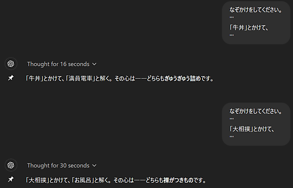 なお、余談ですが、これまでは難しかった「なぞかけ」も、o1-previewではなかなかユニークな回答をしてくれました。ねづっちの域には遠い気がします。