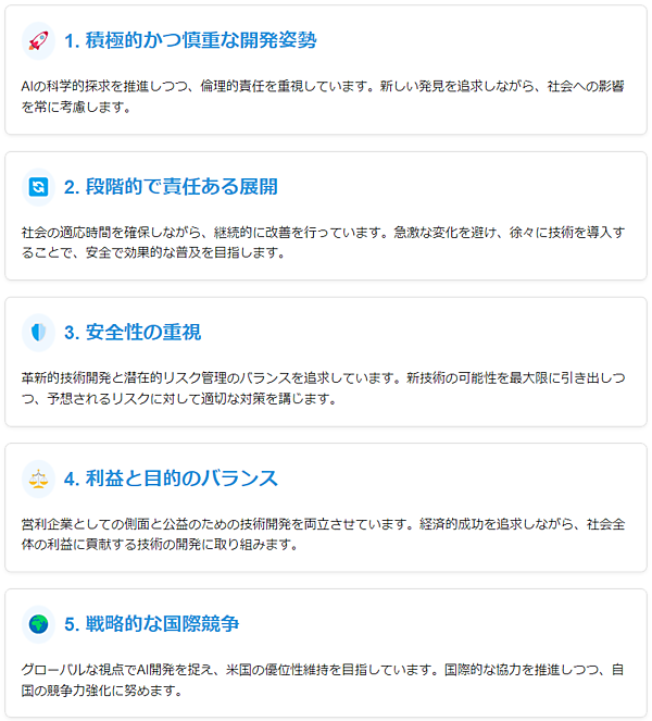 このアプローチにより、OpenAIは革新的なAI技術の開発を推進しつつ、その社会的影響を慎重に管理し、AIと人間社会の調和的な共進化を目指しているのです。