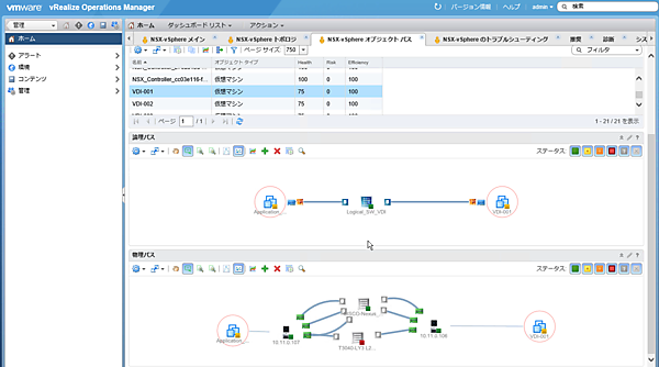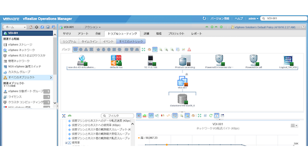 vRealize Operations Managerでは、仮想マシンやネットワークの性能情報を収集済みです。そのためネットワークの構成上のどこで性能の劣化が発生しているのか、障害の影響範囲を容易に特定することが可能です。