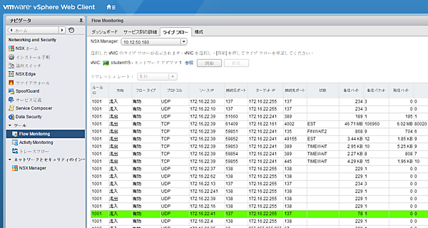 仮想マシンのvNICから通信を行い、経路上にあるコンポーネントを通過していることが確認できる