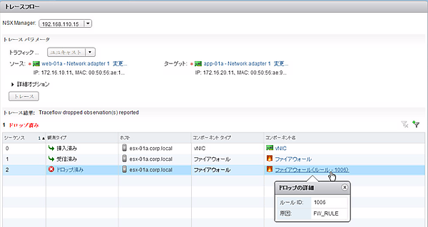 もう1つは、NSX 6.2以降で追加されたトレースフロー機能があります。これは仮想マシンから特定の仮想マシンやIPアドレスに通信を行い、どこの通信経路で異常が発生しているかを可視化できるツールです。仮想マシンのネットワークに異常がある場合、通常は仮想マシンへログインして通信を発生させて確認する必要があります。しかしトレースフローは、仮想マシンが接続する仮想スイッチ上で擬似的に通信を発生させるため、管理権限を持たずログインできない仮想マシンであっても通信確認を行うことが可能になります。またNSXの分散ファイアウォール、論理ルータ、ESXiホストなど通過したコンポーネントがグラフィカルに表示され、通信がドロップした箇所が明確になるため通信障害の切り分けに大きく寄与する機能になっています。