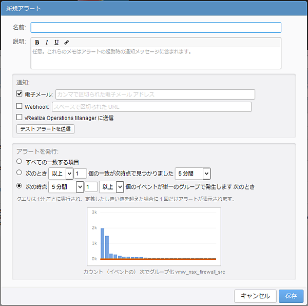 またLog Insightからわかるこれらの情報を元に、アラートを通知できます。メールの他に、この後紹介するvRealize Operations ManagerやWebhookを利用して外部Webサービスと連携することが可能です。