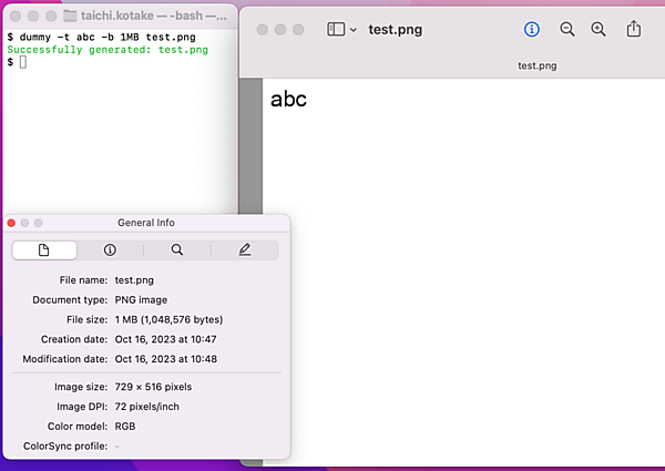 生成したいファイルのパスはオプションなしで指定できます。また、生成するファイルの種類は拡張子によって自動で識別されます。-tオプションでファイルに書き込むテキスト、-bオプションでバイト数を指定できます。-bオプションはPNGファイルを生成するときのみ使用できます。
