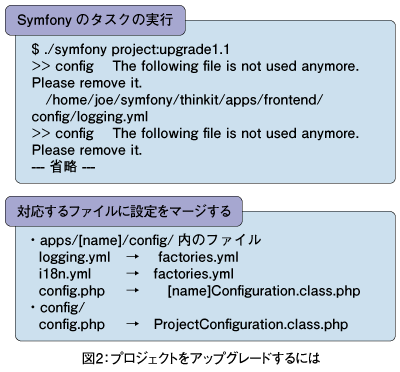 ここまで準備ができたら、プロジェクトのアップグレードを行うためのsymfonyのタスクを図2のように実行します。symfony 1.1は1.0からの変更点がかなりあるので、ある程度コマンドで自動化されています(実際には、それ以外の変更点でエラーが出ることも当然あります)。