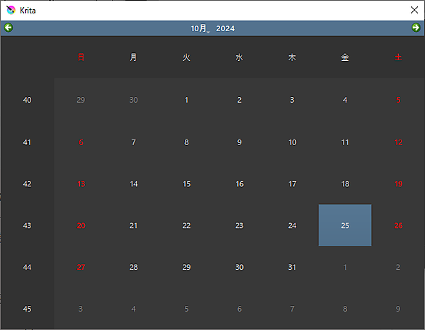 「カレンダー(QCalendarWidget)」は「暦」のことです。月ごとに28~31日ずつ日曜日から土曜日まである普通のカレンダーです(図3)。