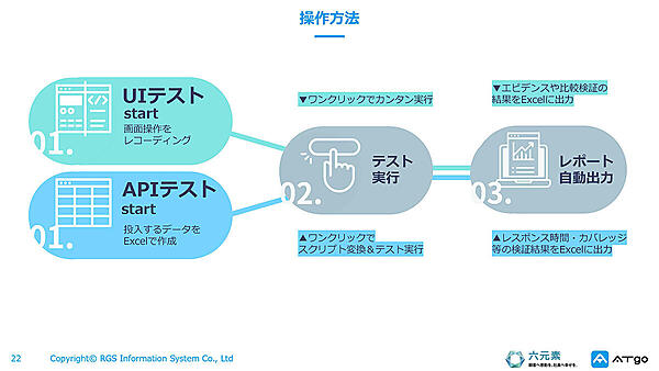 特にATgoが得意とするのは、リグレッションテスト(ソフトウェアの一部を改修した際に、他の箇所に意図しない影響が出ていないか、全体の動作を確認するテスト)とエビデンス作成の支援である。