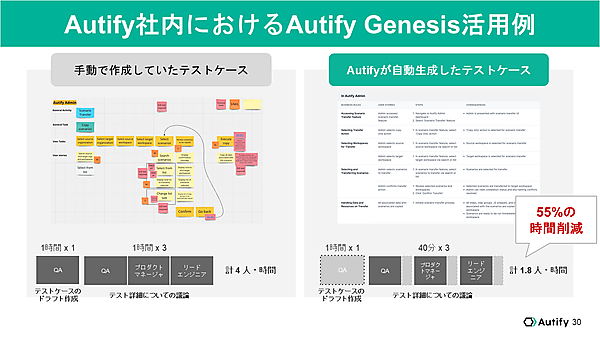 「入力として利用できるのは、テスト対象の振る舞いが書かれた文書です。概要設計書や外部設計書などの仕様書のほか、バグチケット、操作マニュアルなども利用できます。出力されるのは、テストケース、テストシナリオ、テストコードです。実際に、オーティファイ社内でAutify Genesisを活用したところ、あるケースでは55%の時間を削減できることができました」(松浦氏)
