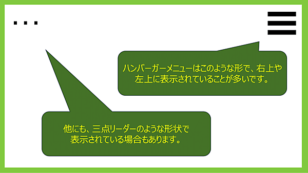 ハンバーガーと言えば、知らない人はいないほど有名な料理の1つです。ご存じの通りハンバーガーは肉や野菜をバンズで上下から挟んで重ねたものですが、このハンバーガーを抽象化したようなアイコンを皆さんは見たことがあるはずです。Webサイトやアプリの画面で右上や左上に設置されるこのアイコンは、その見た目と機能から名前をとって「ハンバーガーメニュー」と呼ばれています。