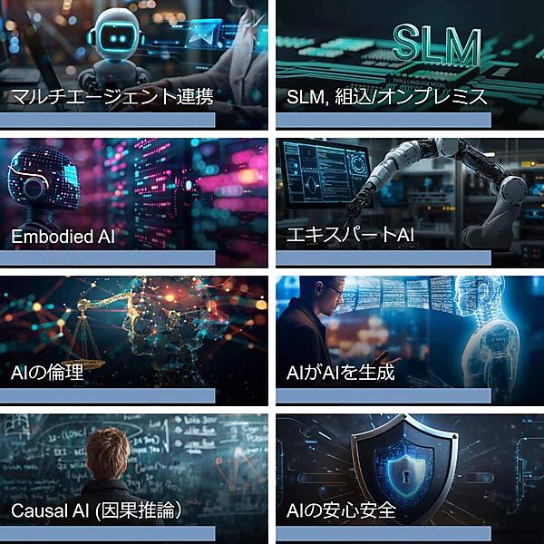 漆原氏は以下のような次世代AI技術に注目しているという。医療用途や製造業、ゲーム開発など特定の用途に特化することで、従来の汎用LLMとは異なる方向性を目指すエキスパートAI。高品質な独自データで学習することで精度を維持しつつスマートフォンや組込デバイスでも動作する軽量なSLM(Small Language Model)。因果関係を理解し基礎科学への応用が期待されるCausal AI。そして複数のエキスパートAIがAPIで連携して自動的にタスクを遂行する、マルチエージェント連携などだ。情報の検索自体がガラッと変わるため、マーケティングや広告などの市場も大きく影響を受けることになる。AIが新しいAIを生成する技術も確立されようとしている。安心安全の仕組みやガバナンスの確立、倫理面の議論も急務だ。