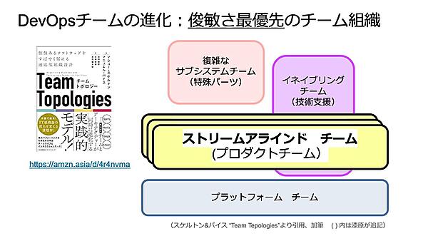 DevOpsのチームも、今後大きく変化していくだろう。開発生産性の向上により価値のデリバリーがさらに高速化すれば、その俊敏さを支えられるように、組織を再編する必要が生じる。そのヒントを与えてくれる書籍として、漆原氏が紹介したのが「チームトポロジー」だ。この書籍が取り上げるのは、複雑なシステム開発において、ユーザーに価値を素早く、頻繁に、安定的に届けるための組織設計の方法論だ。