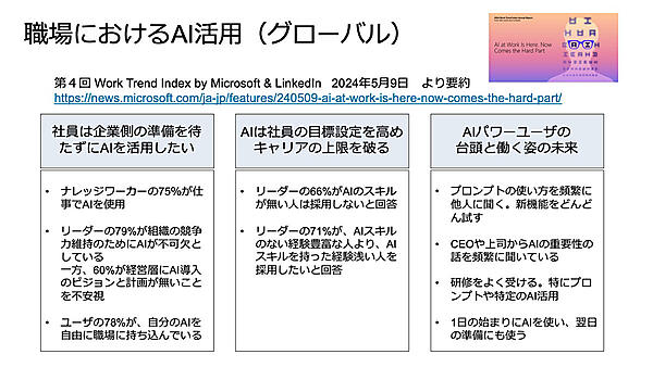 2024年5月にMicrosoftとLinkedInが行った調査によれば、ナレッジワーカーの75%が仕事でAIを使用する一方、60%が経営層にAI導入のビジョンと計画が無いことを不安視しているという。つまり社員は、企業側の準備を待たずにAIを活用したいのだ。一方、リーダーの66%はAIスキルのない人は採用しないと答え、71%がAIスキルのない熟練者より、AIスキルのある人材を優先して採用したいと答えた。