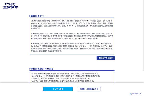 デモへ良い反応をもらえたことで、もうひとつのアイデアであった得意先の中期経営計画の作成に対する、詳しい情報を引き出すことができました。各得意先の中期経営計画に対して、KDDIが持つ資源でどのように経営課題に貢献できるか営業が作成する、最新のフォーマットを共有してもらえたのです。