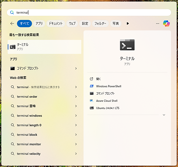 それでは、Windows Terminalの主な機能とその使い方を見ていきましょう。まずWindows Terminalを起動してください。前回でも紹介しましたが、スタートメニューから「ターミナル」を探して実行してください。「すべてのアプリ」の「た」行にありますが「terminal」で検索するほうが簡単でしょう。