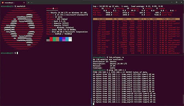 Ubuntu 24.04のプロファイルで開いたタブを3分割した例。左のペインでは対話的にコマンドを入力しつつ、右上のペインではシステムの状態をモニターし、右下のペインではネットワークにpingを送信している