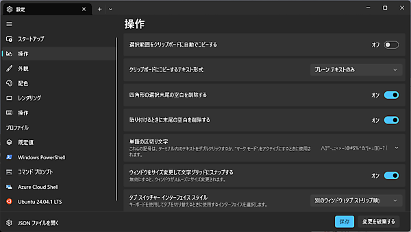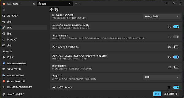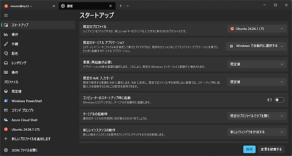 Windows Terminalは、新しいウィンドウやタブを開くとデフォルトでPowerShellを起動します。これは「スタートアップ」の「規定のプロファイル」にPowerShellのプロファイルが指定されているためです。本連載ではWSLをメインに使っていくので、規定のプロファイルをUbuntuに切り替えてしまいましょう。これで、以後はWindows Terminalの起動時や新しいタブを開いたときにはUbuntuのBashが起動するようになります。