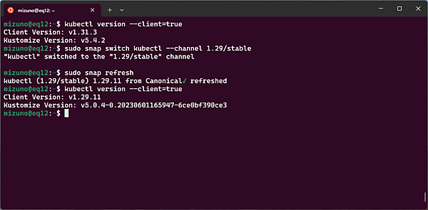 それでは、チャネルを切り替えて2つ前のバージョンである「1.29」をインストールしてみましょう。「switch」サブコマンドでkubectlパッケージのチャネルを切り替えます。