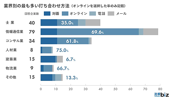 興味深いことに、最近の調査データ*注によると、BtoB企業の打ち合わせの52.5%がオンラインで実施されており、従来の対面式(27.0%)を大きく上回る結果となっています。