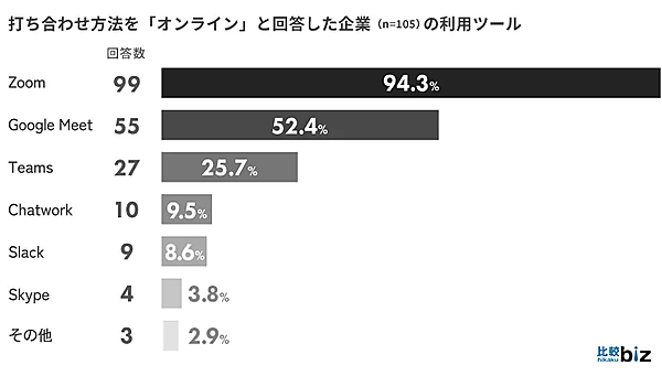 同調査によるオンラインミーティングツール利用率では、全200社中Zoomが最多となる99社で採用され、次点のGoogle Meet(55社)、Microsoft Teams(27社)を大きく引き離す結果となりました。