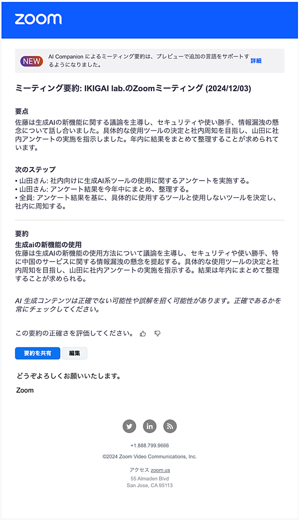2025年に向けて、さらなる進化を予定していているZoom AI Companion。Zoomはコミュニケーションプラットフォームとしての強みを活かし、AIとの自然な協働の形を示してくれているのかも知れません。