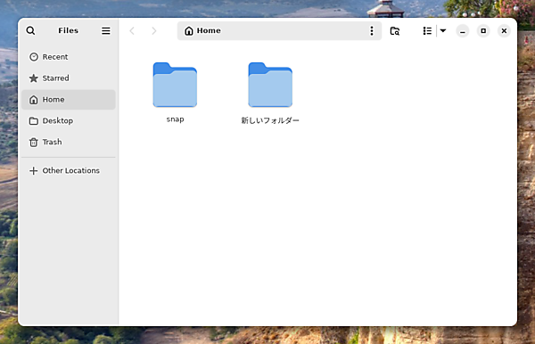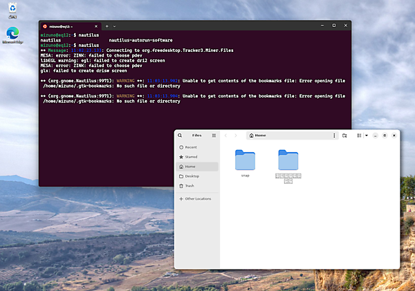 $ nautilusWindowsのデスクトップ上にNautilusのウィンドウが表示されます。WSL内で起動しているアプリケーションですが、Windowsのデスクトップとシームレスに統合されているため、Windowsのネイティブアプリと区別ができないほどです。