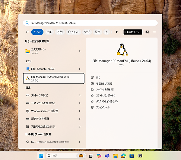 *2: ちなみに、Windowsのエクスプローラーを使ってもWSL内のファイルを操作できます。Windows上のファイルをWSL内へ持ち込みたい場合に便利です。実際に起動してみると分かりますが、WSL内のNautilusは環境に起因する問題によって起動に時間がかかります。そのため、もっと高速に動作する別のファイルマネージャーを使うのもよい考えです。Ubuntuには様々なファイルマネージャーのパッケージが用意されているので、色々試して好みのアプリケーションを見つけてみてください。軽量なLinux用ファイルマネージャーとしては「PCManFM」などが有名です。PCManFMは、以下のコマンドでインストールと起動ができます。