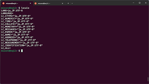 $ sudo update-locale LANG=ja_JP.UTF-8ここまでできたら、一度Windows Terminalのタブを閉じて新しくシェルを起動し直し、新しいシェル上で「locale」コマンドを実行してみましょう。各種変数が「ja_JP.UTF-8」になっていることを確認してください。