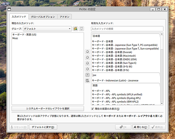 $ fcitx5-configtoolすると、インプットメソッドの設定ウィンドウが開きます。