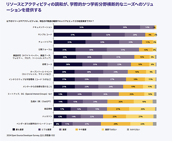 具体的にもう少し詳しく調査の内容を見ていきたいと思います。この調査の回答者は、どのような方法で専門的な知識を獲得しているのでしょうか。下図のように重要なリソースとしてドキュメント(99%)やサンプルコード(89$)などが挙げられていますが、オープンソースイベント(72%)やミートアップ(63%)なども重要なアクティビティとして認識されているようです。これらがベンダーのトレードショーよりも上位に来ていることは、とても興味深いですね。