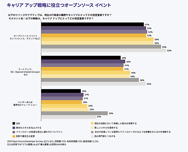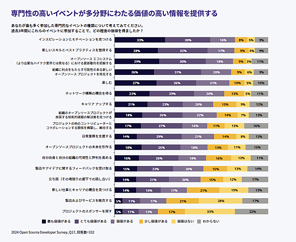 この調査は「モチベーション」「インスピレーション」「スキルの伝達」「ベストプラクティス」「コミュニティ開発」「楽しみ」「ネットワーキング」など多岐に渡っており、オープンソースへのより深い関与を促進する手段として効果的であることが分かります。特に「インスピレーションとモチベーションを見つけること」は63%、「ネットワーキングの機会」は53%が高い価値または非常に高い価値があると評価しており、オープンソースイベントで得られる新しい知識と人脈を今後のキャリア形成につなげようとする傾向が表れています。