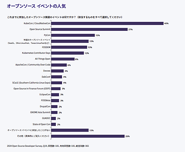 下図にあるように、最も参加者が多いイベントは「KubeCon/CloudNativeCon」で、回答者の40%がこのイベントに参加した経験があると回答しています。次に、回答者の27%が参加した「Open Source Summit」、そして回答者の15%が参加した「PyCon」が続きます。KubeConの参加者は、このイベントについて「KubeCon Americasは、オープンソースが唯一の方法であると、私を完全に納得させてくれました」と述べています。