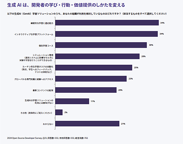 最後に、今後「生成AI」がどのように影響してくるのかも大きな課題であると言えると思います。下図にあるように、生成AIは「継続的な学習と適応能力」「インタラクティブな学習プラットフォーム」「個別学習コース」で利用が検討されており、開発者の既知のニーズや予測されるニーズに具体的に応えるようになることを期待しているように思います。