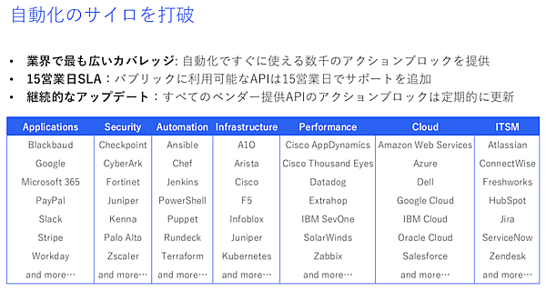 次が「既存の自動化の強化」だ。自動化ツールにはAnsibleやTerraformなども存在するが、IBM Rapid Network Automationはそれらで作成した自動化をそのままワークフローに組み込んでの再利用が可能だ。PythonやJavaなどによる既存スクリプトのワークフローへの組み込みにも対応し、既存のワークフローをベースに自動化を順次、拡張することができる。
