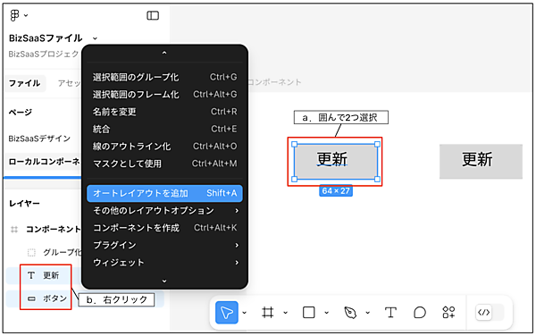 図6左はボタンの上に更新という文字が乗っていますが、このままでは“赤の他人”です。試しにボタンをドラッグして移動させてみてください。「更新」という文字は置いてけぼりになりますね。この2つを一体化させるには「グループ化」と「オートレイアウト」の2つの方法があります。