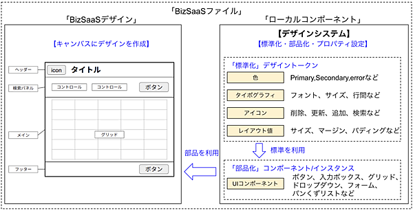 図1はデザインシステム(右側)を作成し、それを利用して画面(左側)をデザインする概念を表したものです。まず、色やタイポグラフィ、アイコン、レイアウトなどの標準化を行い、それを利用してボタンや入力ボックスなどのUIコンポーネントを作成します。そして、これらのコンポーネントを利用してキャンバスにデザインを作成していきます。