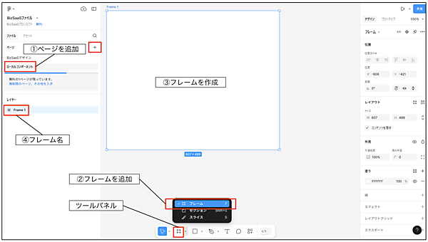 Figmaにログインして「BizSaaSファイル」を開き、ページの追加「+」から「ローカルコンポーネント」という名前でページを追加してください。 - ツールパネルからフレームを追加