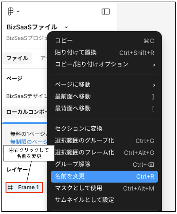 マークはフレームを意味します。Frame1を右クリックして、名前を「コンポーネント」に変更してください(図3)。