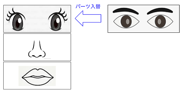 なぜ、1枚のキャンバスではなくフレームを複数使ってデザインするのでしょうか。この疑問には昔のモンタージュ写真を用いて説明しましょう。昭和の刑事ドラマでは、目撃者にモンタージュ写真を見せて容疑者の人相を作ってもらう場面がよく出ました。最初に図4のように目の部分だけを次々と切り替えて似てる目を選んでもらい、次に鼻、そして口というようにパーツ単位で切り替えていきます。