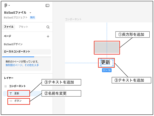 長方形「ボタン」の中にテキスト「更新」という文字を入れましょう。PowerPointなどでは長方形の中に直接文字を書けますが、Figmaの場合はテキストで「長方形」という文字のオブジェクトを作成し、その後で「ボタン」と組み合わせる操作になります。