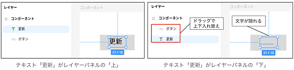人間の兄弟との違いは、Figmaの上と下はドラッグで入れ替えできる点です。試してみましょう。「更新」を「ボタン」の上に移動させると図6左のように文字が見えますが、レイヤーの上下を入れ替えると図6右のように見えなくなります。