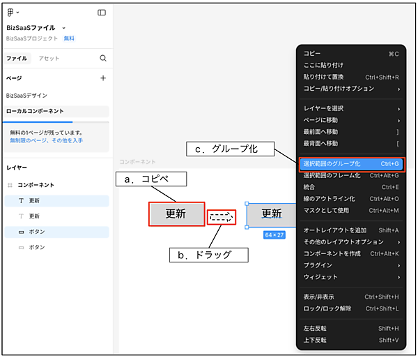 右側にずらした2つの要素を一緒に選択した状態で右クリックすると図7のようなメニューが表示されるので「選択範囲のグループ化」を選んでください。これで長方形「ボタン」とテキスト「更新」がグループ化され、レイヤーパネルに