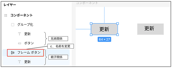レイヤーパネルに作成されたFrame 1を右クリックして「名前を変更」を選択し、「フレーム ボタン」という名前に変更してください。ツリーを開くと図9のように長方形「ボタン」がフレームという親になり、その子要素としてテキスト「更新」が一体化されたことが分かります。2つの要素をまとめているグループ化との違いが分かりますか。d. フレームとオートレイアウトの違い