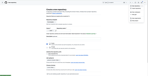 GitHubアカウントを作成し、ログインした後、右上にある「+」ボタンをクリックし、「New repository(新しいリポジトリ)」を選択します。