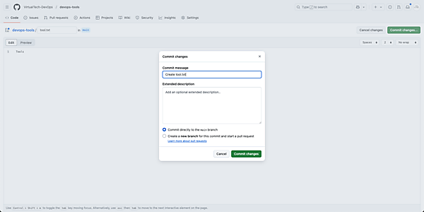 GitHubページにアクセスしてAdd file > Create new fileを選択し、ファイル名をtool.txt、内容をToolsと入力します。最後にCommit changes...をクリックして変更をコミットします。